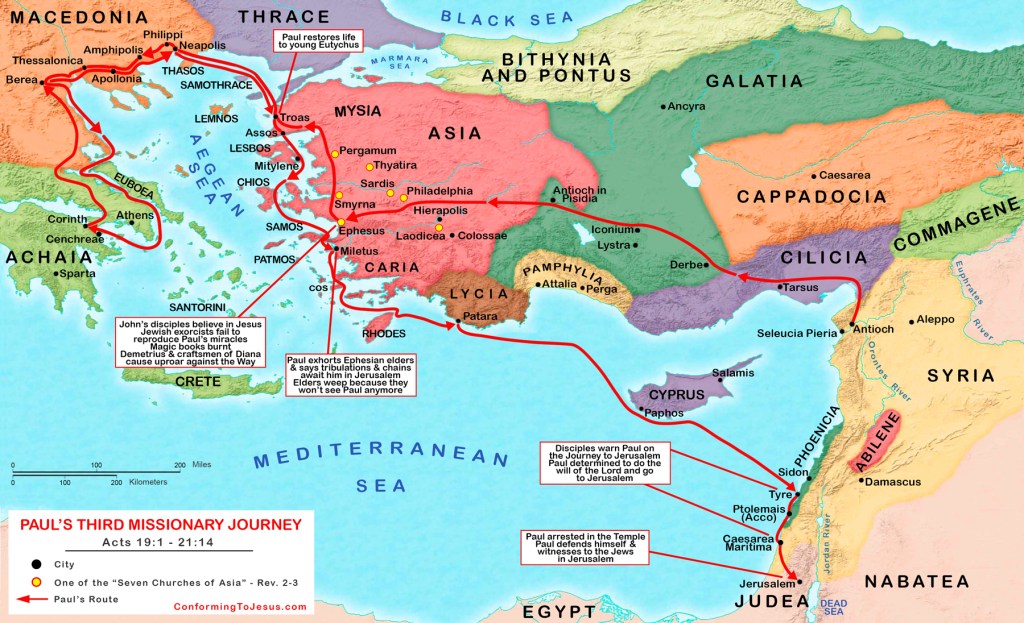 Continuing with the story of Paul’s 3rd teaching tour, he arrives in Ephesus not too long after Apollos departure for Corinth. He met a group of 12 men who seemed to be disciples, but inquired of them, …he said to them, “Did you receive the Holy Spirit when you believed?” So they said to him, “We have not so much as heard whether there is a Holy Spirit.” And he said to them, “Into what then were you baptized?” So they said, “Into John’s baptism.” (Acts 19:2-3) This group were taught by Apollos and baptized according to John’s baptism.