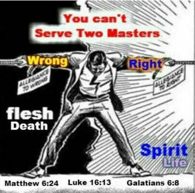 The scriptures listed in this meme are: “No one can serve two masters; for either he will hate the one and love the other, or else he will be loyal to the one and despise the other. You cannot serve God and mammon.” (Matthew 6:24) “No servant can serve two masters; for either he will hate the one and love the other, or else he will be loyal to the one and despise the other. You cannot serve God and mammon.” (Luke 16:13), and For he who sows to his flesh will of the flesh reap corruption, but he who sows to the Spirit will of the Spirit reap everlasting life. (Galatians 6:8)