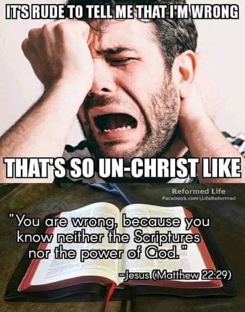As mentioned last week, people invent the Jesus they want to follow and completely ignore the one as seen in scriptures. Regarding the verse mentioned in today’s meme, Jesus was challenged by the Sadducees concerning the resurrection even thought they themselves do not believe it. After their question was asked, Jesus put it to them bluntly and told them they were wrong! He didn’t walk on eggshells to avoid hurt feelings; he told them what they needed to hear.