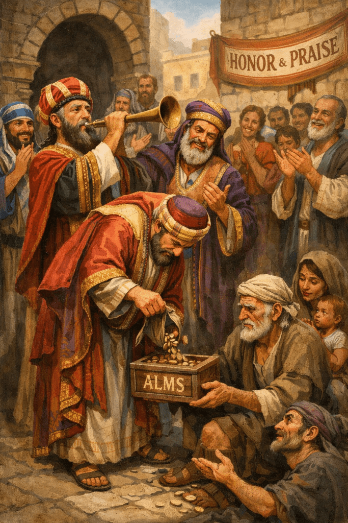 The first example concerns charitable deeds. Jesus said in verse 2, “Therefore, when you do a charitable deed, do not sound a trumpet before you as the hypocrites do in the synagogues and in the streets, that they may have glory from men. Assuredly, I say to you, they have their reward.” (Matthew 6:2)